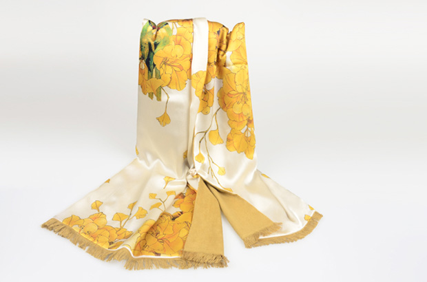 禪心藝術(shù)是龍翔的老客戶了,從2015年開始,就一直在制作真絲絲巾與真絲拉絨相結(jié)合的真絲復(fù)合圍巾,也將山水花鳥的圖案放在圍巾中,更有新意的是,禪心藝術(shù)還將旗袍中的盤扣與圍巾縫合在一起,讓山水花鳥畫的圍巾不失意境美的同時,又顯得更加的高貴和優(yōu)雅。