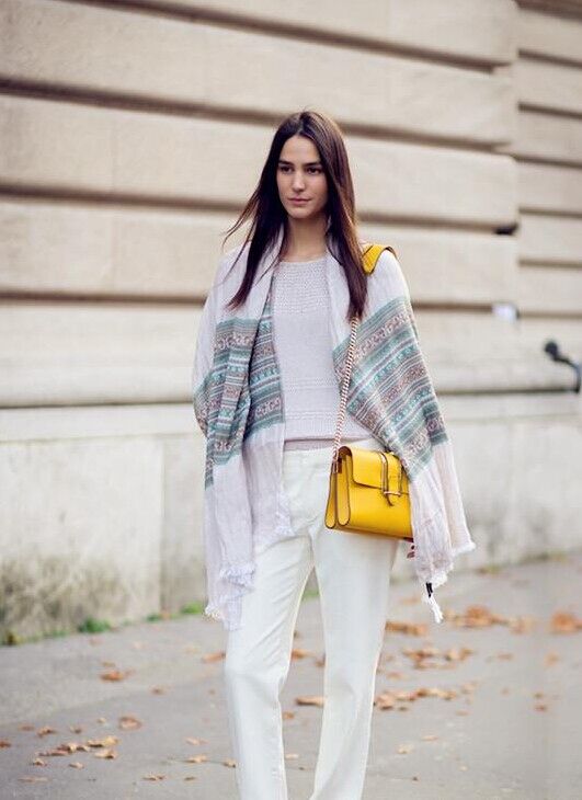 一款素雅的印花絲巾搭配同色系灰色針織衫,極簡優(yōu)雅又很有街頭休閑范。配上一條時(shí)下正熱的白色闊腿褲,時(shí)尚指數(shù)瞬間上升。亮眼的黃色鏈條包十分搶鏡,惹眼的色彩瞬間點(diǎn)亮整個(gè)造型,而腳上的棕色平底涼鞋也與長絲巾色彩呼應(yīng),整個(gè)look不夸張、不媚俗,舒適又優(yōu)雅。