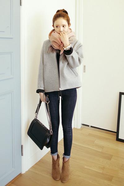 粉色系的圍巾襯托女孩甜美清純的氣質,讓本來有些中性化的帥氣穿搭增添了少女般的柔美味道,配上光潔的丸子頭,顯得清新可愛極了。