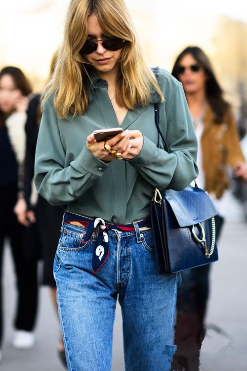 取一條色彩和褲子接近的絲巾,在腰間系一個(gè)柔軟的小結(jié),為你最平常不過(guò)的單品帶來(lái)煥然一新的面貌。