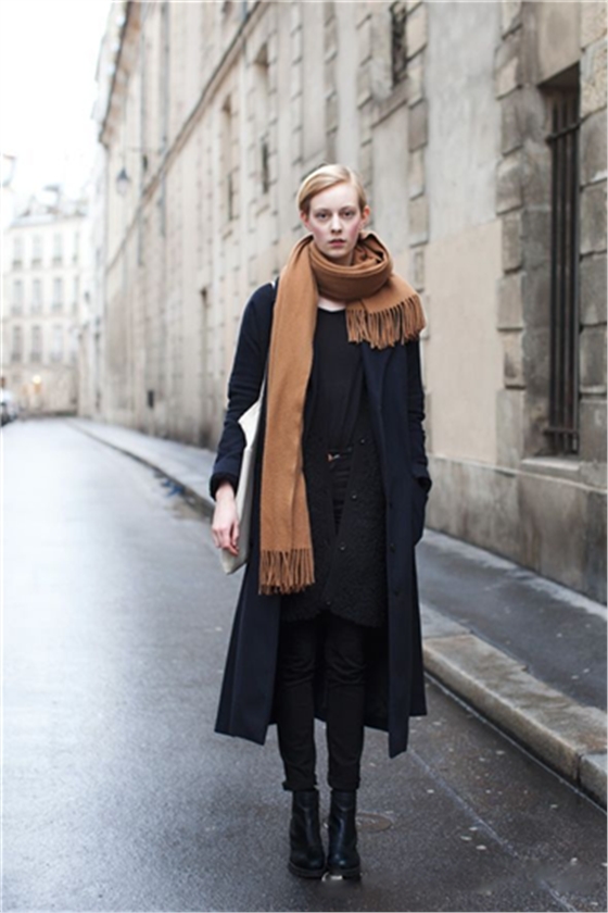 Look 1:黑色的呢子大衣稍顯神秘高貴,搭配咖啡色純色圍巾,黑咖的經(jīng)典搭配。高貴大氣有質(zhì)感,彰顯穿著者成熟優(yōu)雅的氣質(zhì)。