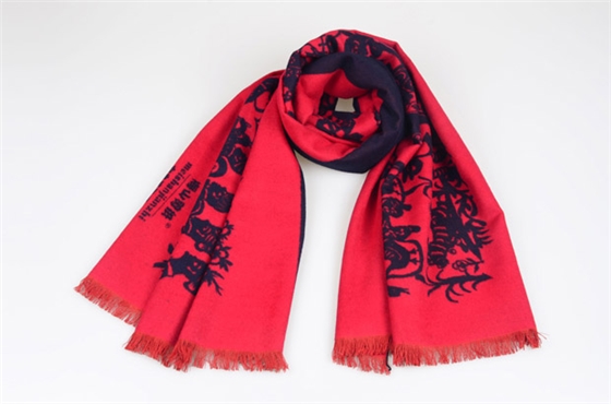剪紙的圖案通過(guò)提花的形式表現(xiàn)在圍巾上,加上合適的配色,適中的流蘇,類(lèi)似羊絨手感的面料,讓圍巾?yè)碛袀鹘y(tǒng)色彩的同時(shí),又不失時(shí)代的美感。