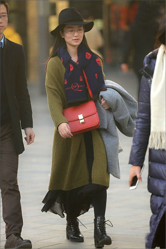 毛衣長開衫內搭飄逸裙裝,再配上粗跟馬丁靴小禮帽,大圍巾裝飾更添保暖。