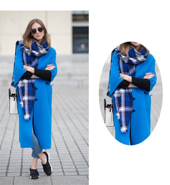 【搭配示范】:打底衫+藍色長款大衣+緊身牛仔褲+運動鞋+藍色格紋圍巾+單肩挎包
