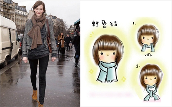 step 2:把右邊那段圍巾繞過左邊那段,再從空隙中穿過