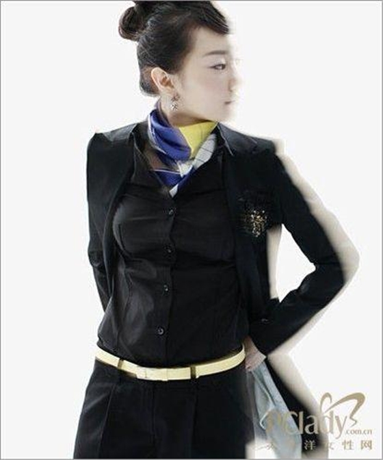 時尚點(diǎn)評:黑色的襯衣加上西褲的職業(yè)套裝,將嚴(yán)肅感散發(fā)到極致,腰部的白色細(xì)腰帶雖然也夠搶眼但總有種不敢靠近的距離感。如果你的職位就需要和同事職員之間有距離感那這身裝扮可以得滿分,但你希望既有距離感又有稍微的親和力,那么加入一條絲巾吧。傳統(tǒng)的系法不會打破你工作的原則,而絲滑的質(zhì)感又帶有一絲飄忽不定的溫柔氣質(zhì)。